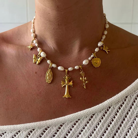 Mary Rosary Lariat Cross Halskette – Gold / Silber